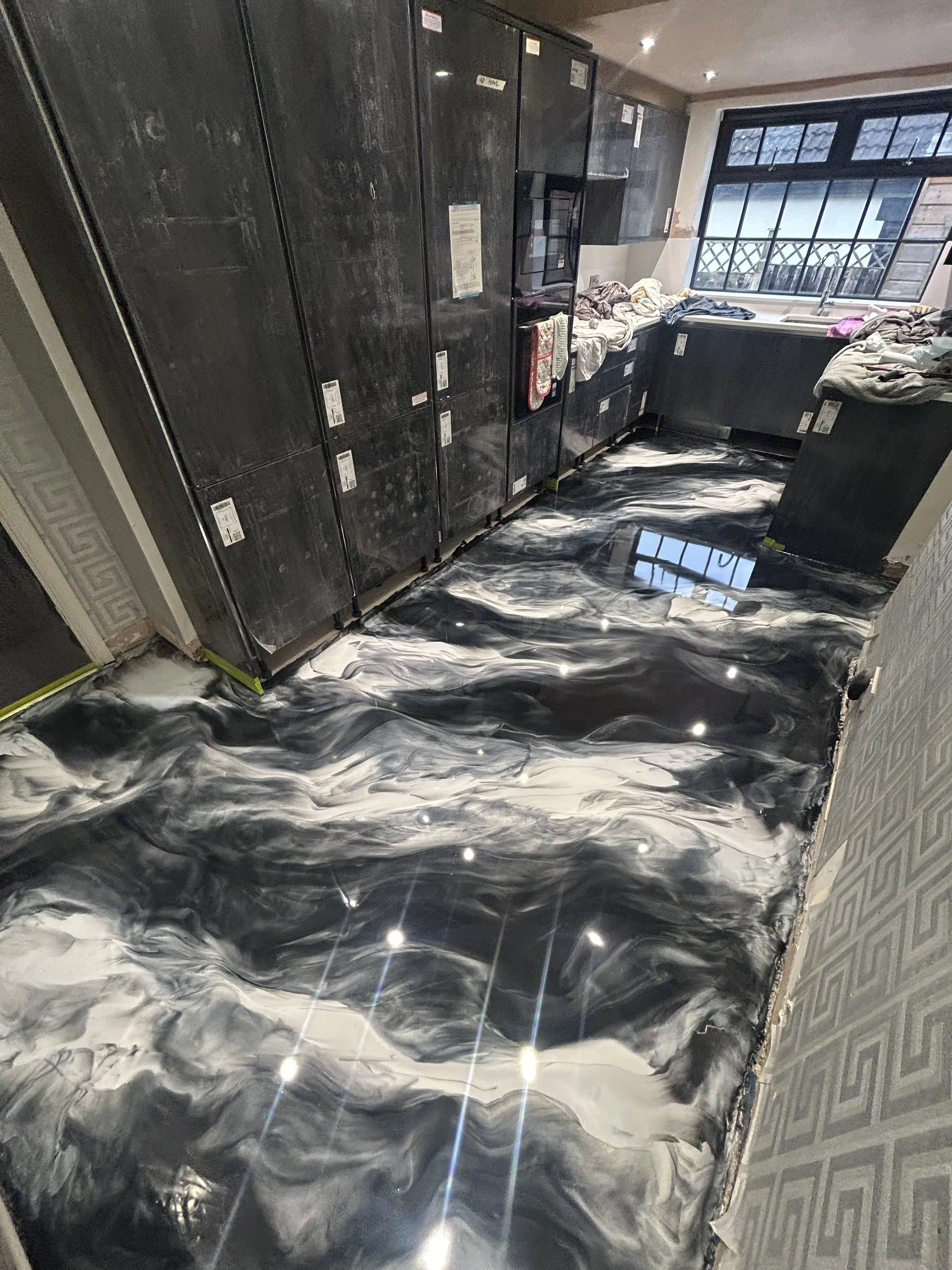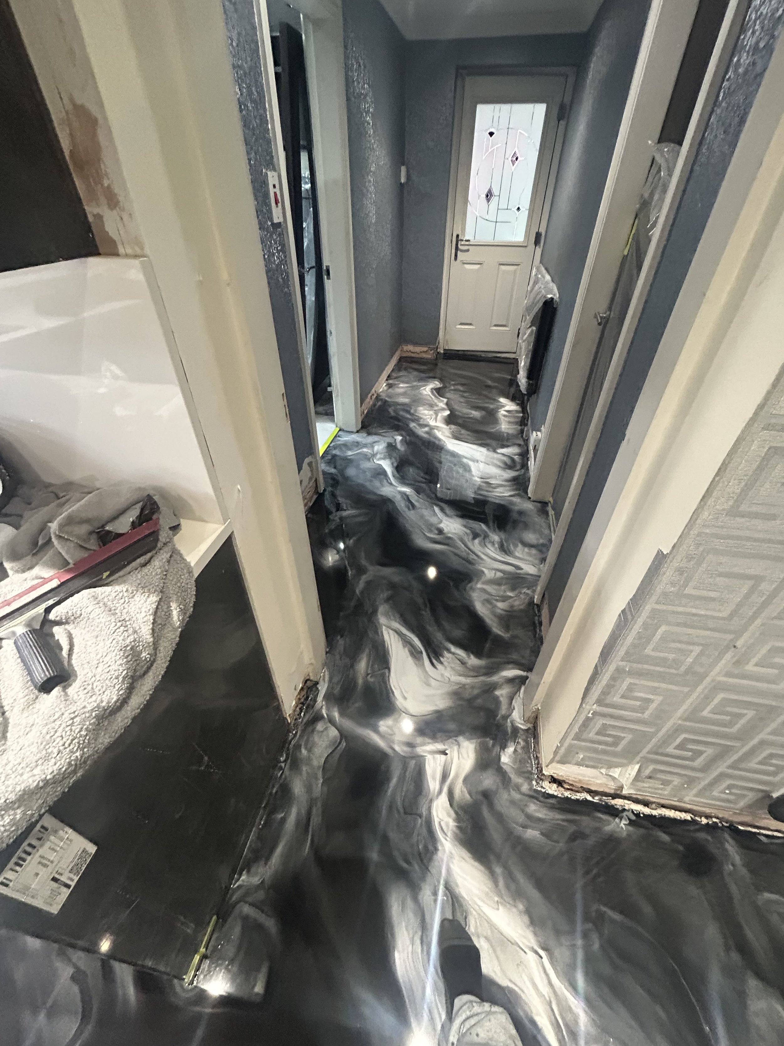 We then poured and manipulated tthe metallic epoxy pigments by hand. Using Black Pearl, Satin White Grey, and Luster Grey, we created a flowing, layered marble-effect finish that gives the floor depth and movement.