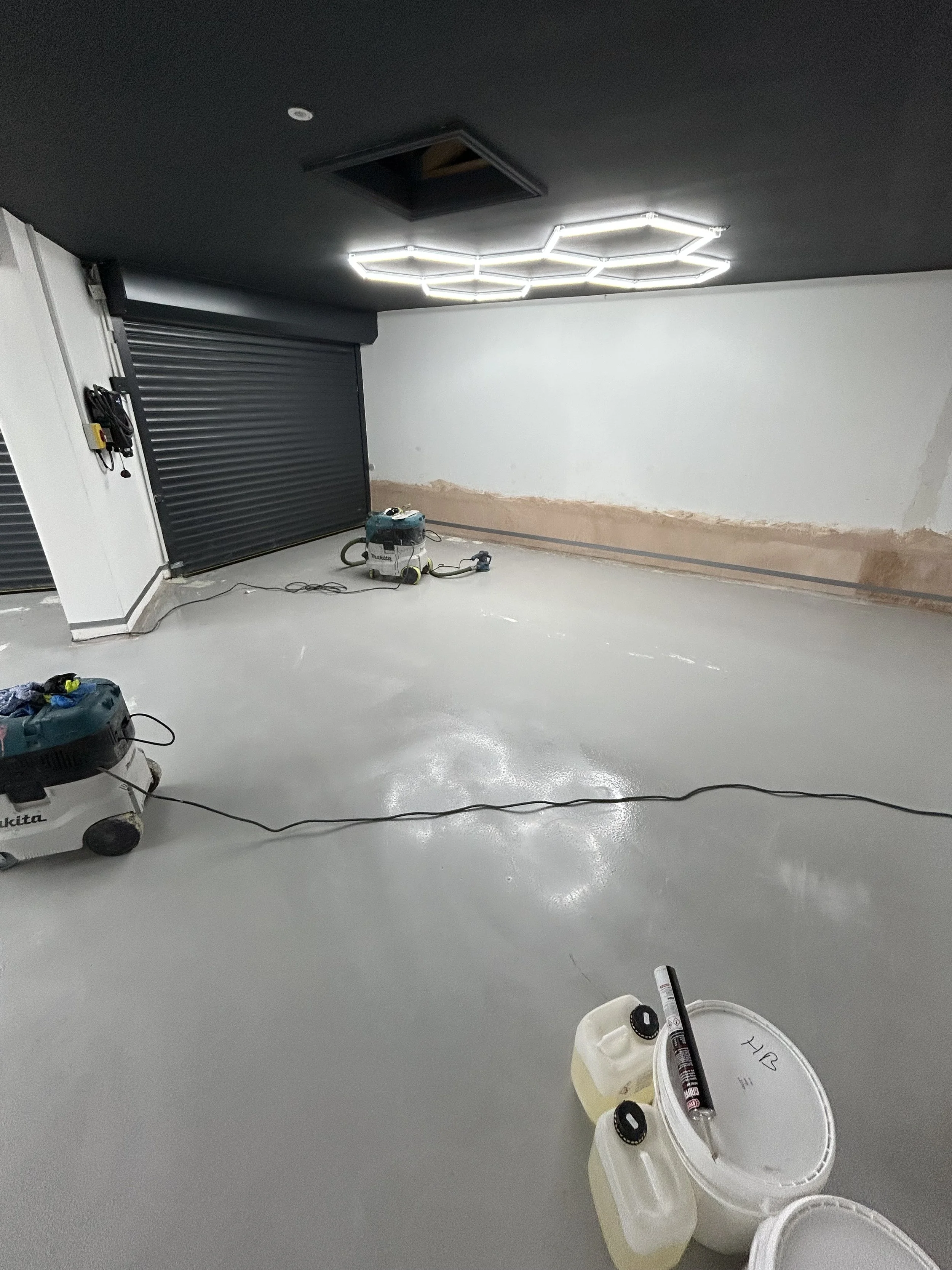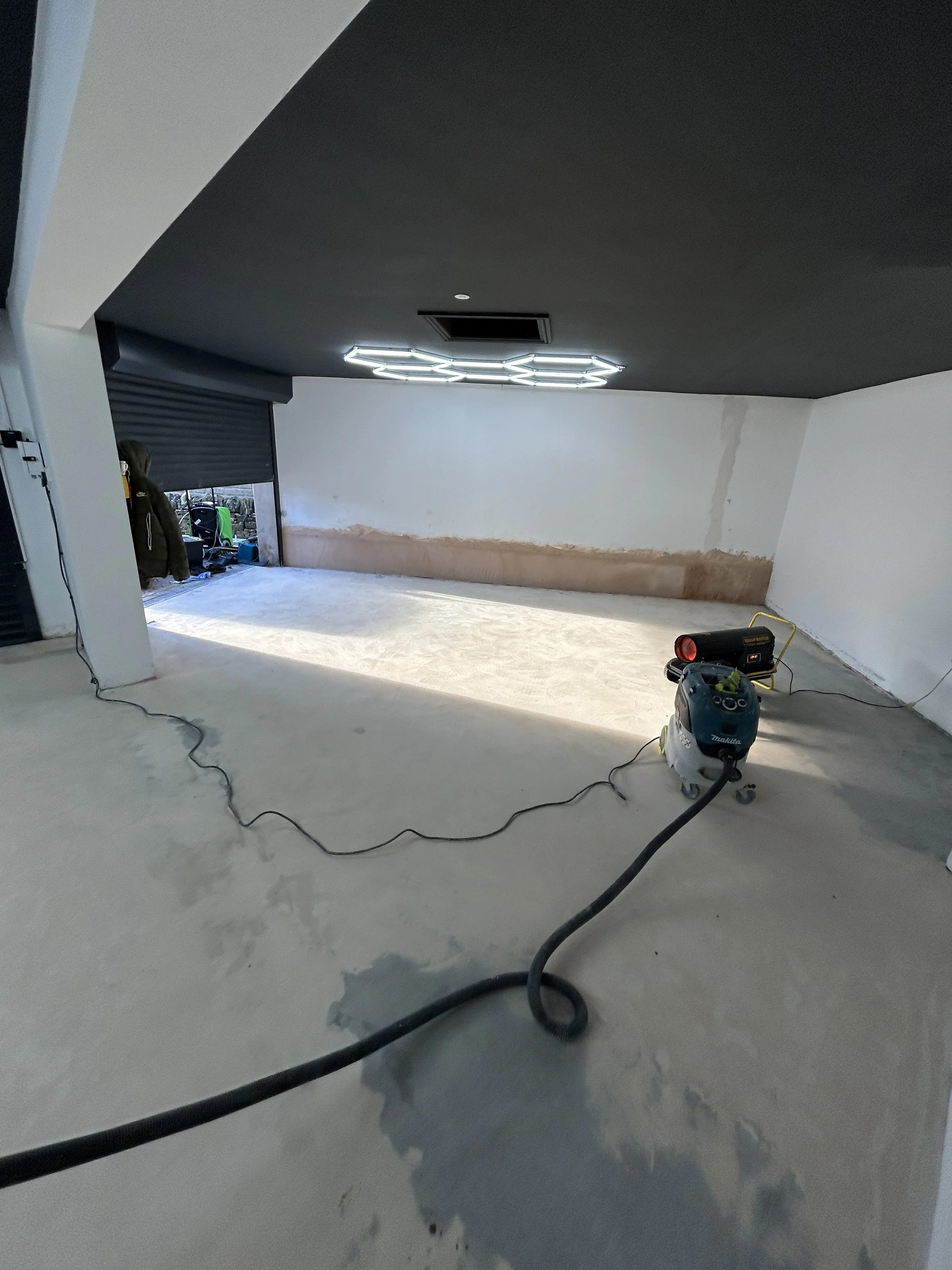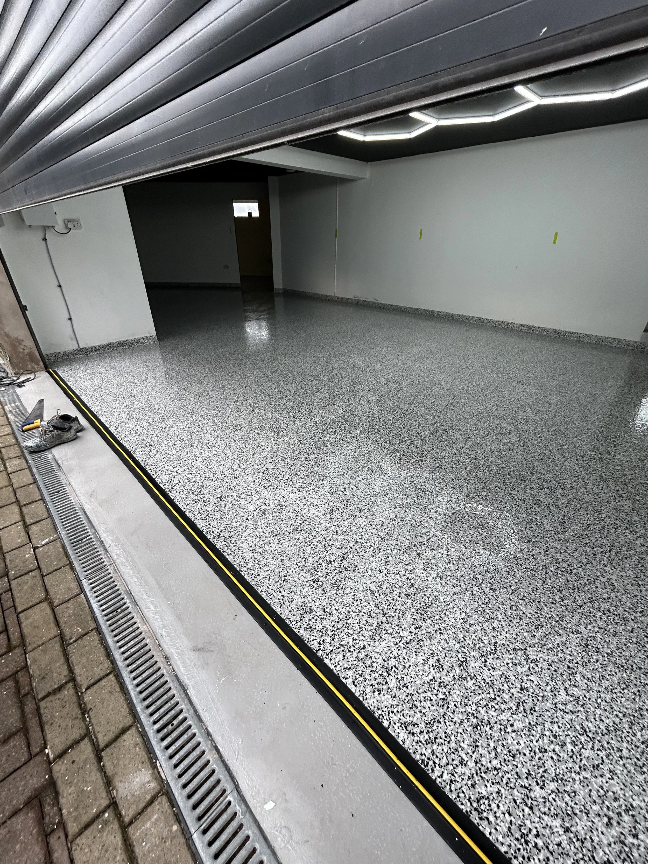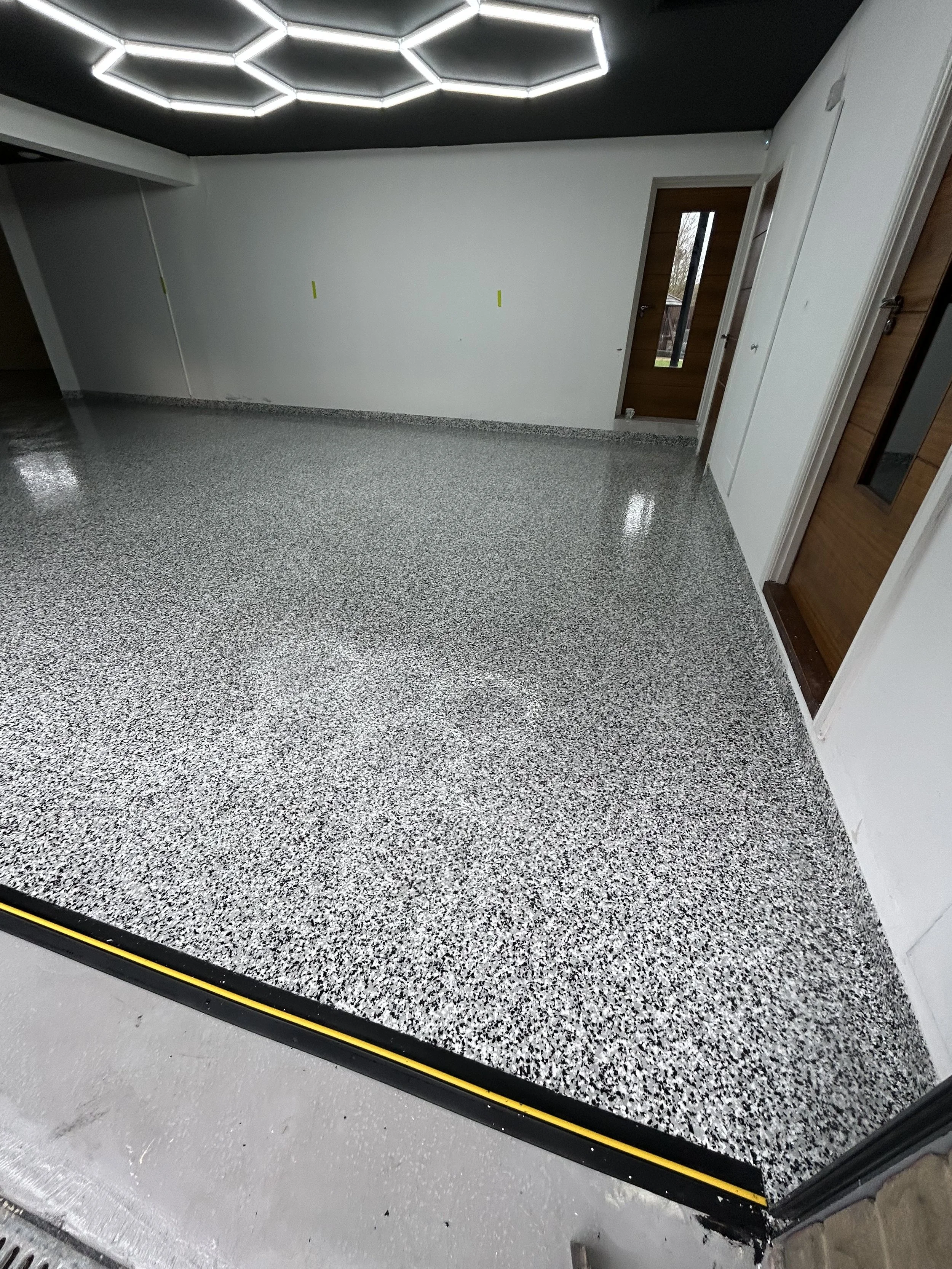 Recently, we completed an exciting transformation on an 80m² garage in Yorkshire, turning a tired, stained concrete slab into a sleek, durable, and waterproof garage resin floor using a premium polyaspartic flake system in the striking colour blend Domino. The project presented both challenges and opportunities, including water ingress issues, uneven drainage, and a client with a keen eye for design—particularly their stunning hexagonal LED lighting system that needed to complement the finished floor.