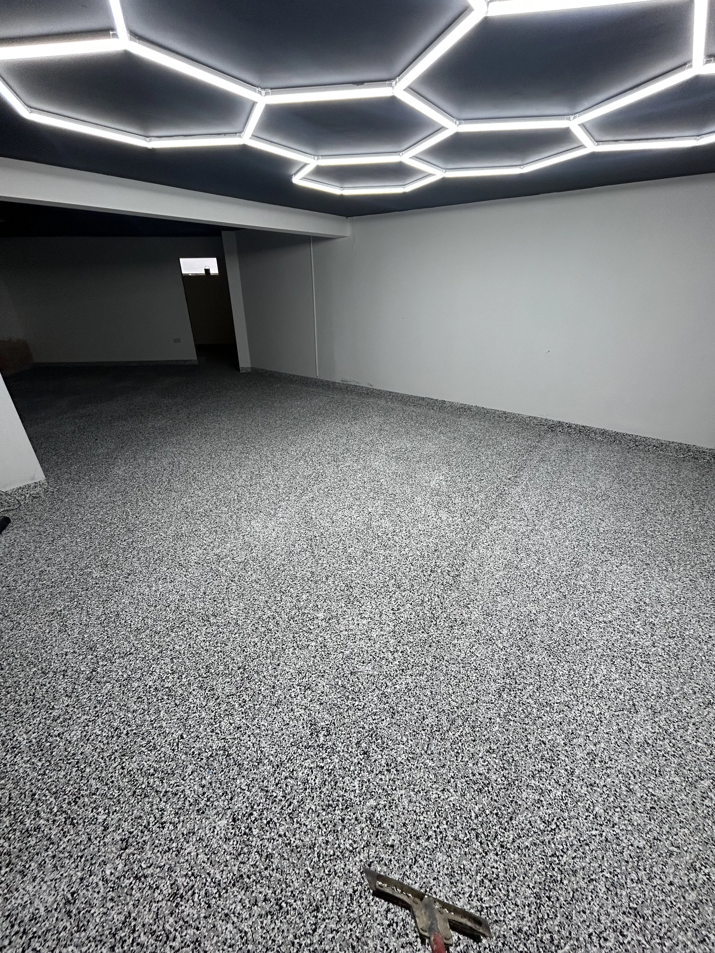 One of the most exciting aspects of this project was how the finished floor interacted with the client’s hexagonal LED lighting system installed on the garage ceiling.