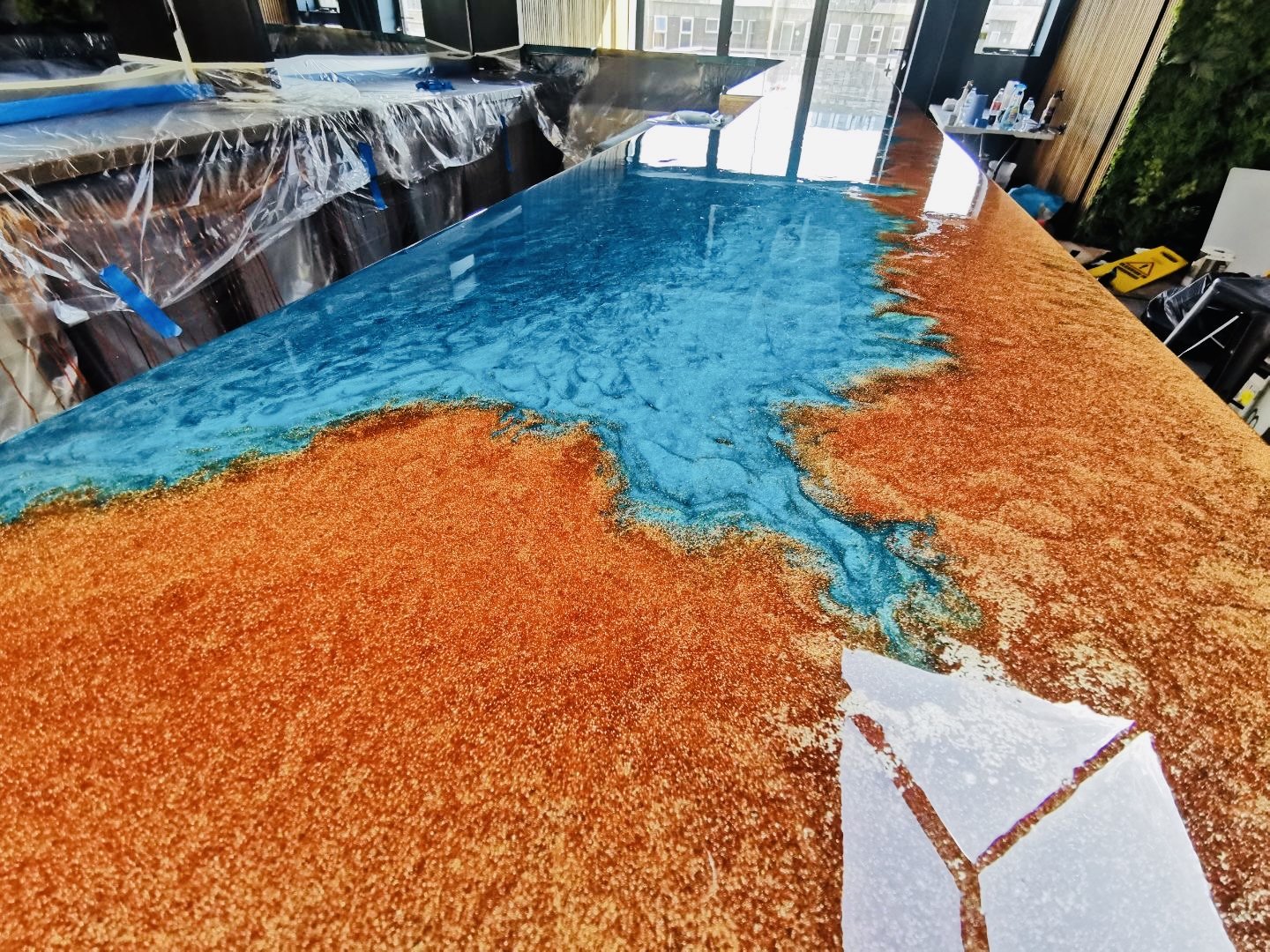 The bar is always the centerpiece of any venue — it’s where people gather, talk, and enjoy the atmosphere. For The Cove, we wanted the resin bar top to feel like a living shoreline. Using worktop resin pigments, we layered rich bronze tones with vibrant ocean blue epoxy to mimic the natural meeting of sand and sea.