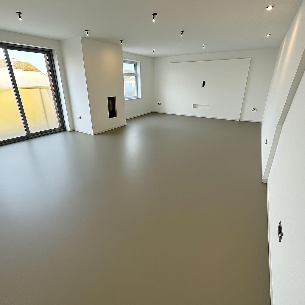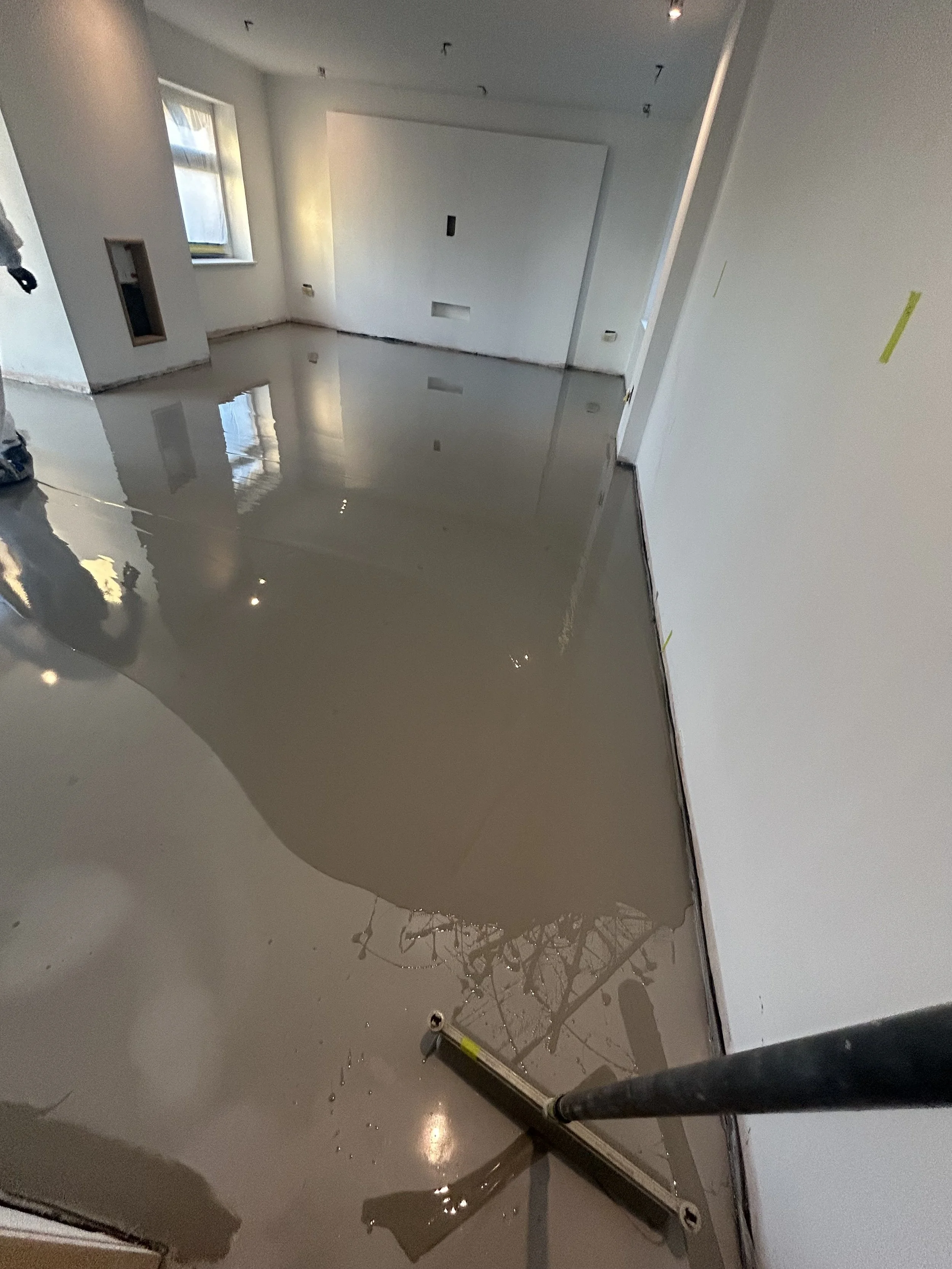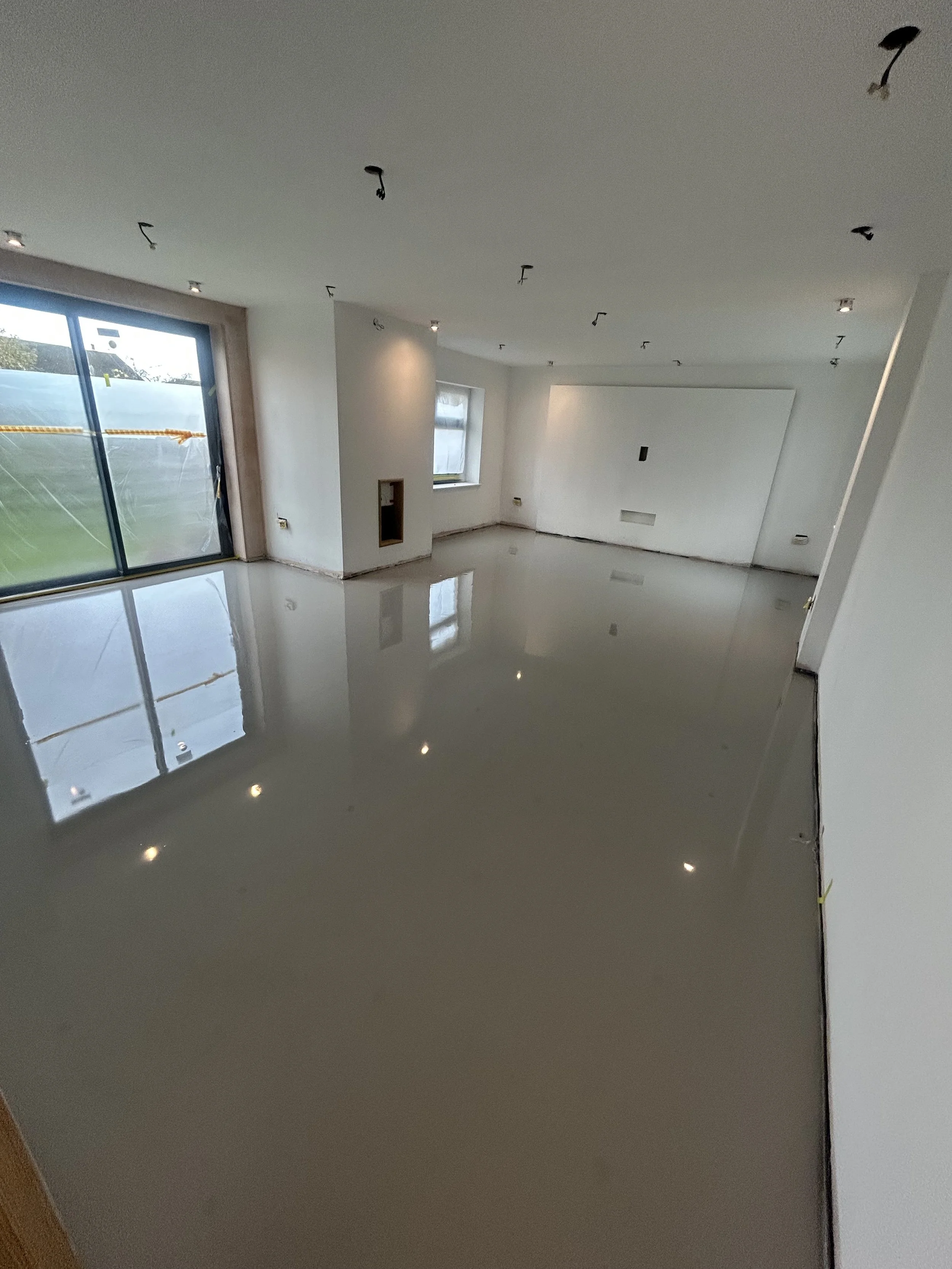Our client wanted a single, unified flooring system across the entire ground floor — stretching from the living room to the kitchen, hallway, utility zones, and wet areas. They selected RAL 7015, a deep, modern grey tone that perfectly suits open-plan homes and pairs well with both minimalist and warm interior styles.