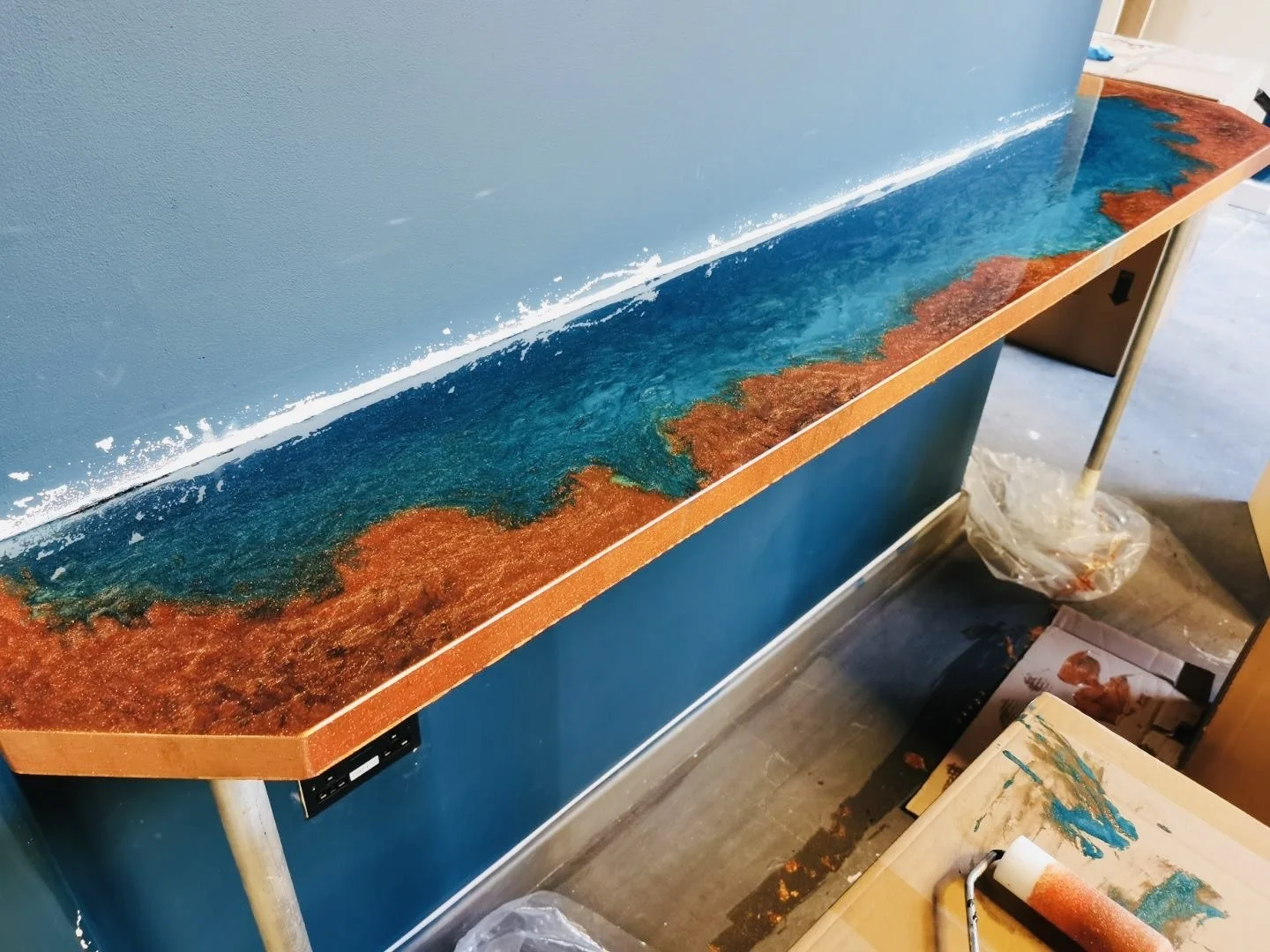 We applied a base layer of clear epoxy resin, which served as the foundation for our ocean scenes.